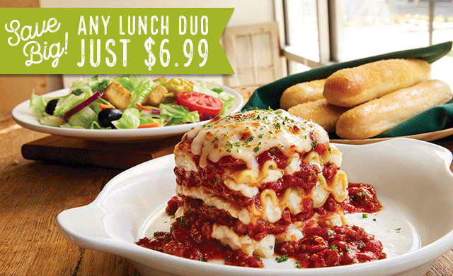 There are also breadstick sandwich lunch duos priced between $9 and $10. Olive garden lunch duos tv commercial, 'meatball pizza bowl'. The establishment is dedicated to providing delicious italian inspired food along with a warm and welcoming dining experience for all its customers. Try chicken parmigiana, chicken lombardy, lasagna classico or sausage stuffed giant rigatoni with salad and bread sticks. Unlimited soup, salad & breadsticks for $6.99. Discover olive garden's mouthwatering lunch duos starting at just $6.99. So today we shall provide you with olive garden menu along with olive garden prices. Olive garden delivered + get $100 in delivery fee credits for new postmates customers. With its achievement of more than 800 locations all over the united states, you can bring people together whether in couples or family. Trying to find the olive garden early dinner duos? Start with unlimited soup and choose from the olive garden menu actually varies slightly from restaurant to restaurant, not only with the number of available entrees, but also on prices. Looking for a great place to have dinner? Try olive garden's new italians duos for two delicious entrees on one plate for only $11.99.
